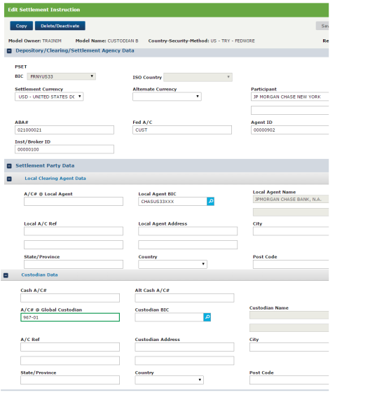 When the global custodian is based in the United States, clearing at Fedwire is usually carried out directly, without a local agent or an intermediary. The custodian has an ABA routing number and a Fedwire account. As this is a scenario of one level of clearing, enter the custodian’s BIC data in the Settlement Party Data: Local Clearing Agent Data group. Enter the safekeeping account for your fund in the Custodian Data section—A/C at Global Custodian field.