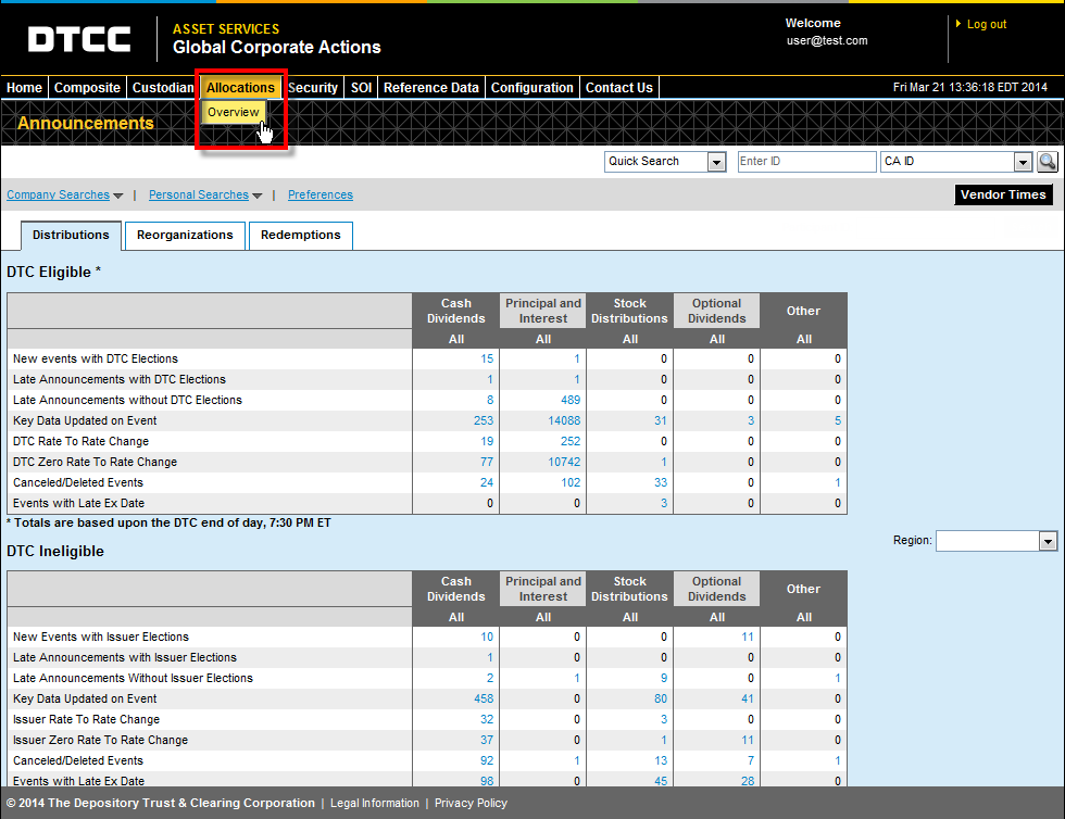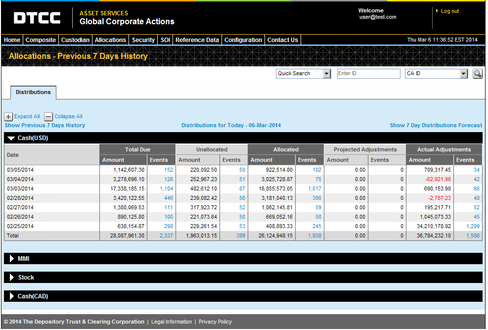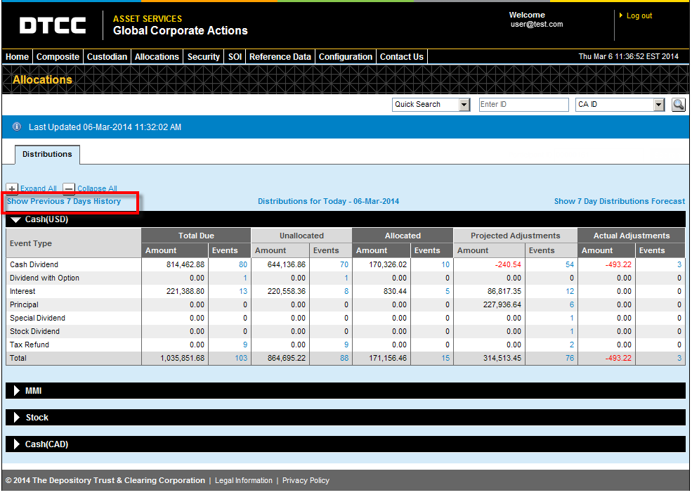 The Allocations Overview page provides you with a snapshot of your distributions as of today. You can also look at information for the next seven business days, as well as for the past seven business days.