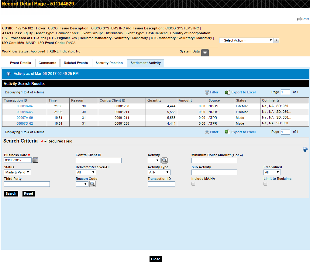 The Settlement Activity tab allows you to search for settlement activity pertaining to the CUSIP displayed in the Summary area at the top of the page.