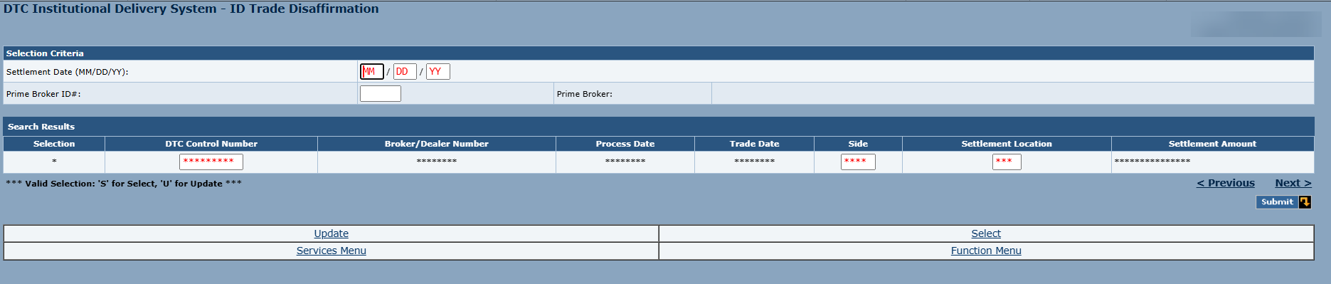 Prime brokers have the option under certain circumstances, to disaffirm an affirmed confirmation back to unaffirmed status. Only prime brokers have access to the IDPB disaffirmation function in the TradeSuite ID service through PBS terminals. When disaffirmation becomes necessary, the prime broker can use the IDPB function to enter the individual DTC control number of those trades to be disaffirmed.