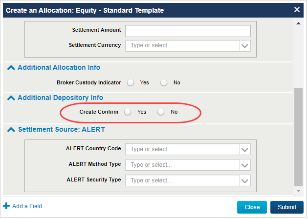 As with other fields in manual entry, to take advantage of the Create Confirm feature, first click the + Add a Field link in the lower left section of the Create an Allocation dialog box to add it as an option.