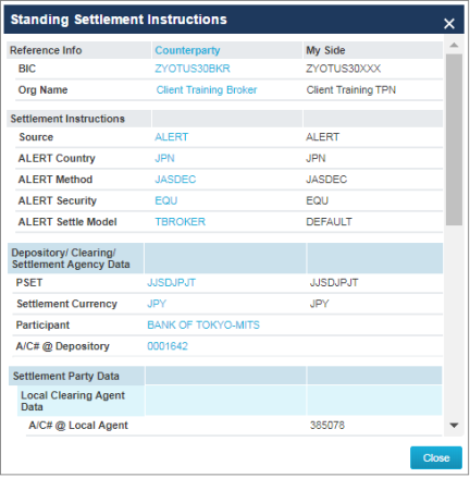 - The UI displays each trade party's SSIs for its own trade side and its counterparty trade side.