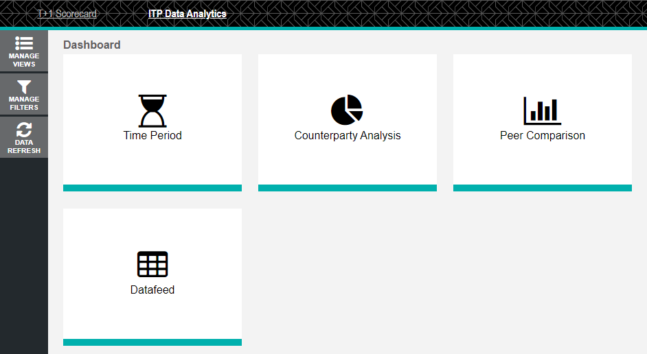 The dashboard displays a module for each report type and allows you initiate a report, manage your views, refresh the data, or view your T+1 scorecard.