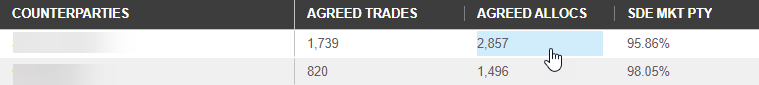 The data grid displays the results of your filter selections in a table. Metric names appear as column headers, and counterparty organization names appear as rows.