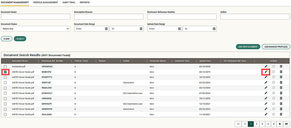 - On Document Management window, select the document to be edited and click the Edit icon (