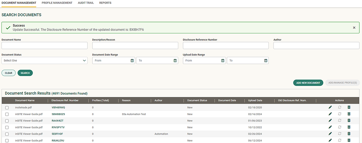 - The Success banner will display indicating that your update was successful for the document with assigned Disclosure Reference Number . The document information is added to the Active Disclosure Documents list. Once a document is uploaded and confirmed as correct, it cannot be removed from the site.