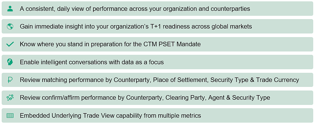 A global shift towards T+1 settlement cycles has intensified the need for clear & efficient ways to prepare, assess and demonstrate operational performance across a variety of different dimensions at more frequent intervals. The ITP Analytics service addresses these challenges head-on, providing a simplified, streamlined and centralized solution for assessment of post-trade, pre-settlement execution.