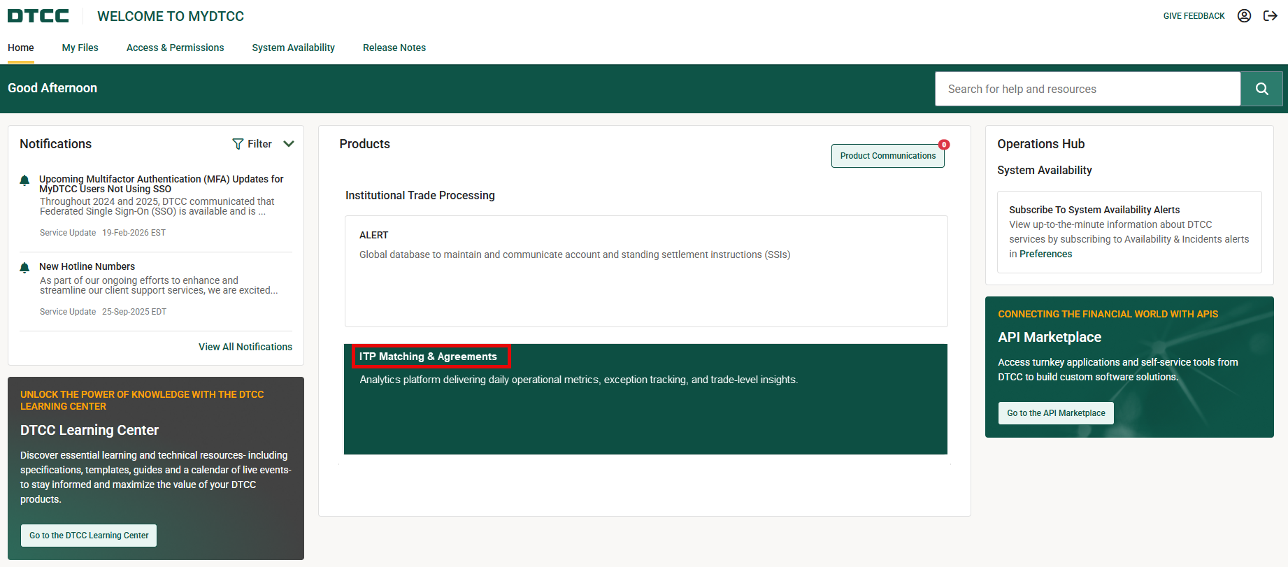3. For the user to access ITP Analytics, the user should log into MyDTCC and select the ITP Matching and Agreements tile as shown below.