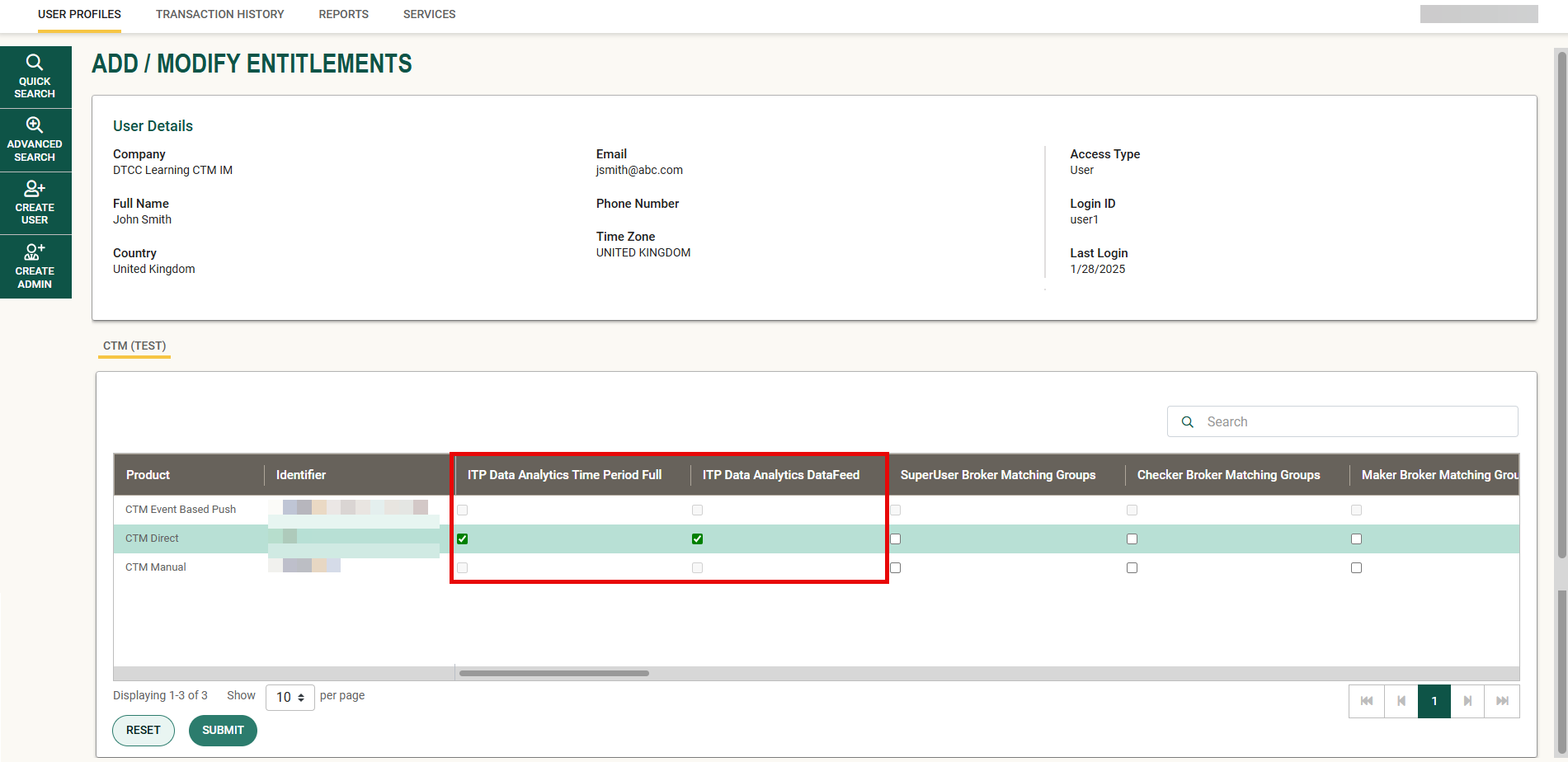 2. Click Next to move forward to the Add / Modify Entitlements window. Review the section above entitled Existing user of CTM or TradeSuite ID? and follow the steps to apply the relevant entitlement role(s) to the new user ID depending on your ITP Data Analytics subscription.
