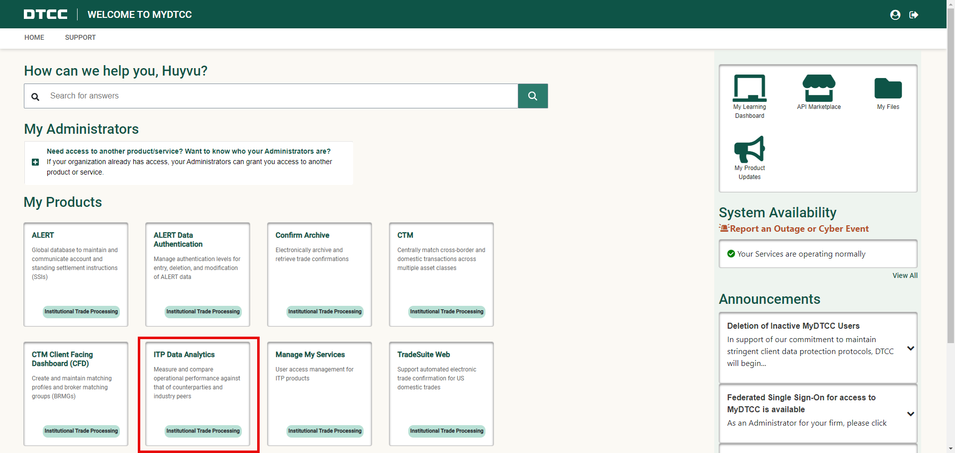 1. Go to MyDTCC - My Products and select Need access to another product/service? Want to know who your Administrators are? Select the appropriate ITP product. A list of your current Product Administrators will appear.