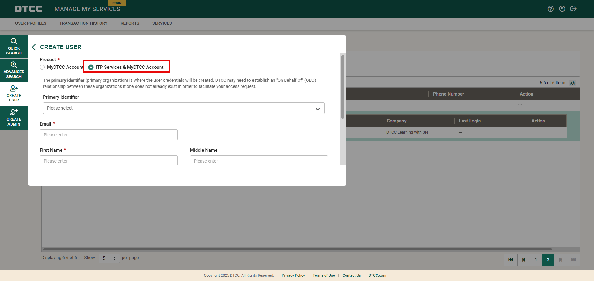 a) When creating a new user in Step 1, select Product: ITP Services & MyDTCC Account